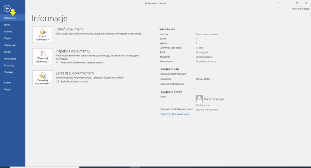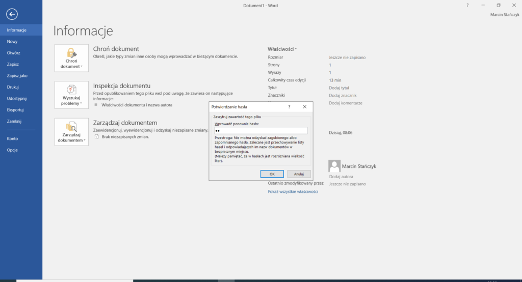 Jak mamy już stworzony dokument i chcemy zabezpieczyć go hasłem, należy najpierw wejść w „Plik”