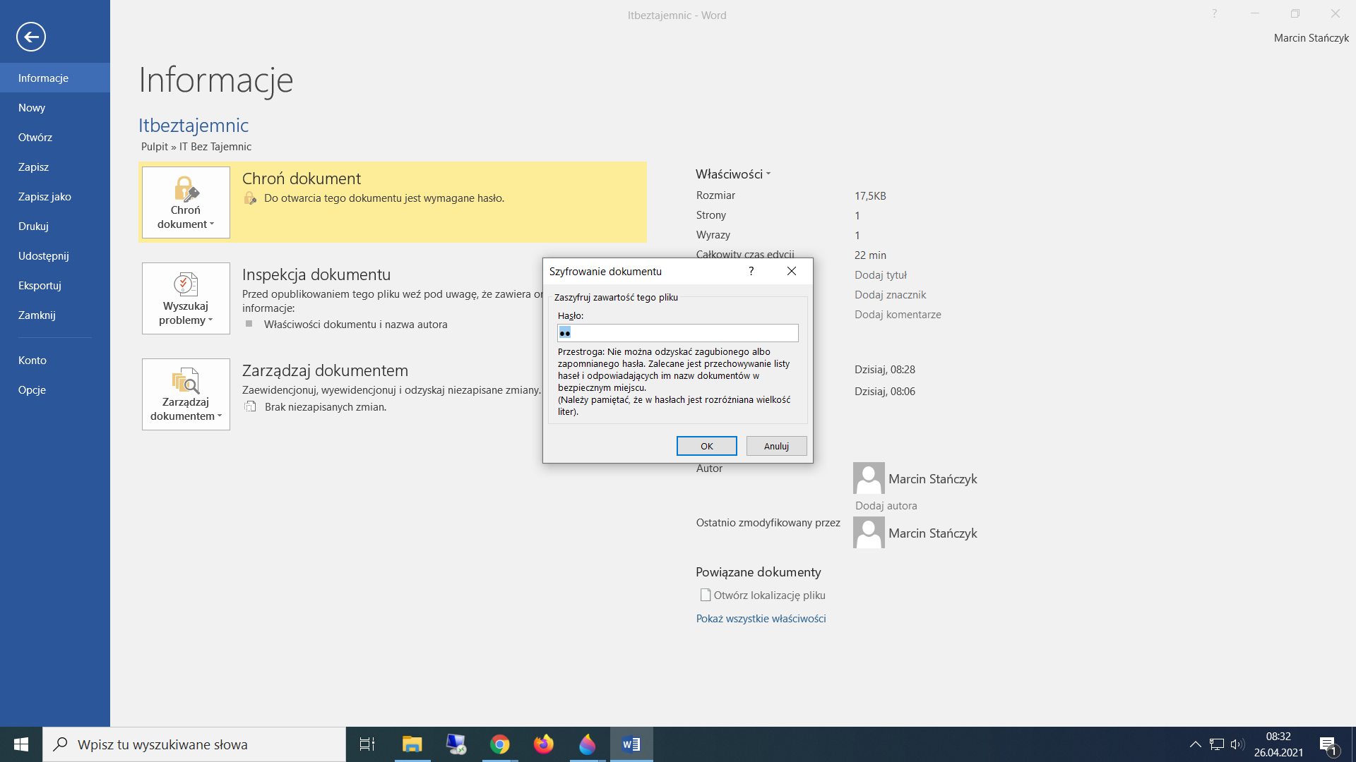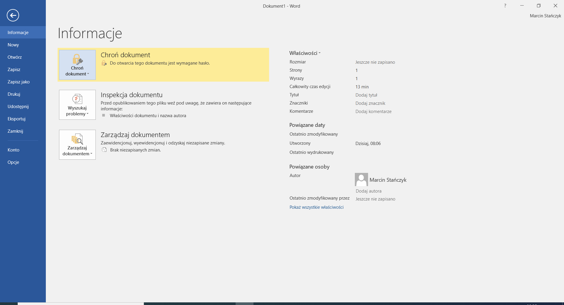 Po powyższych operacjach dokument został zabezpieczony hasłem i powinniśmy mieć opcję „Chroń dokument” podświetloną, jak poniżej.