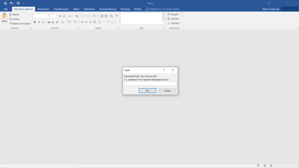 Jak dokument jest już zapisany, aby przetestować poprawność hasła możemy wyłączyć dokument i otworzyć go ponownie. Jeśli wszystko przebiegło poprawnie powinno wyświetlić się nam okienko jak poniżej. Po wpisaniu w nim hasła i kliknięcia w „OK” uzyskamy dostęp do Naszego dokumentu.
