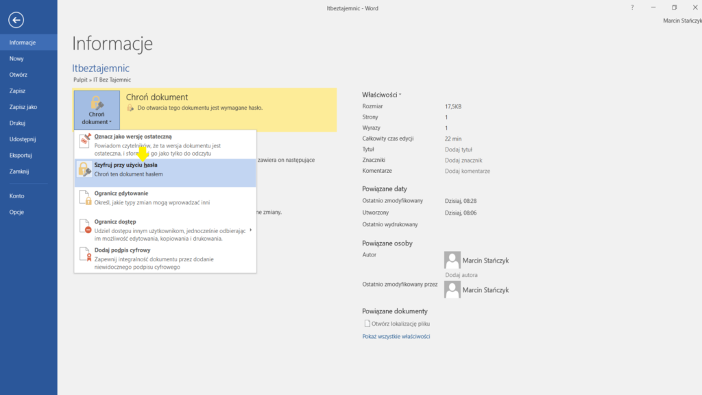 Wysyłając ważne dokumenty w formacie doc* przez pocztę email warto jest pomyśleć o zabezpieczeniu ich hasłem przed nieautoryzowanym dostępem. W dzisiejszym wpisie przedstawię jak krok po kroku można to zrobić. Poniższa instrukcja jest na przykładzie programu Word 2016, ale w dokładnie taki sam sposób można to zrobić w pozostałych programach pakietu Office takich jak Excel, PowerPoint…